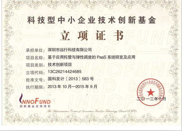 2013年9月,遠行科技的"基于應用托管與彈性調(diào)度的PaaS系統(tǒng)研發(fā)及應用"項目(立項代碼:13C26214424685),獲國家科技部2013年技術(shù)創(chuàng)新基金資助,得到了國家科技部的高度認同。