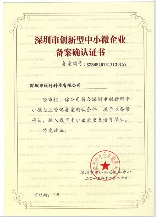 根據深圳市經濟貿易和信息化委員會出臺的《深圳市中小企業創新幫扶行動計劃實施方案》,深圳市中小企業服務中心組織對本市創新型中小微企業實行備案確認,經審查評估,我司符合備案確認條件,并頒發了備案確認證書。