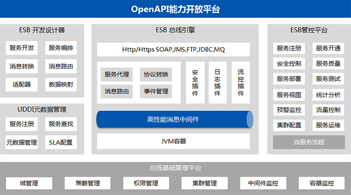 最后一個內容是SOA管控平臺,主要的作用是實現服務的全生命周期管理,包括服務的元數據管理,服務目錄庫,服務的申請,服務的開通和鑒權,服務運行日志審計和監控,服務運行分析,服務預警,服務SLA等各種功能。即SOA管控平臺提升了對ESB引擎本身的管控和治理能力。