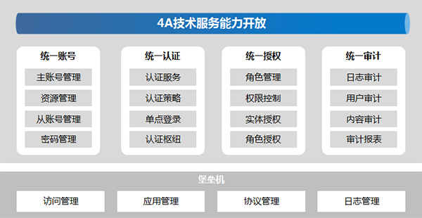 4A技術服務組件提供統一賬號管理,統一認證,統一授權,統一安全審計的安全服務能力。通過該技術服務建設實現用戶的統一管理和統一接入控制,同時通過統一日志審計滿足薩班斯法案要求。