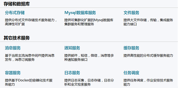 技術中臺為業務中臺微服務模塊提供各類可復用的技術組件服務開放能力,包括數據庫、存儲、緩存、消息、通知、任務、日志管理等。