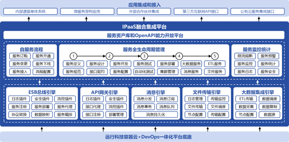 iPaaS融合集成平臺通過云原生技術和多種集成引擎,幫助企業實現不同系統、數據和服務之間的無縫銜接。平臺支持微服務架構、傳統單體應用、外部應用、數據庫、消息中間件等多種集成場景,提供統一的接口集成、管理、監控和運維功能。